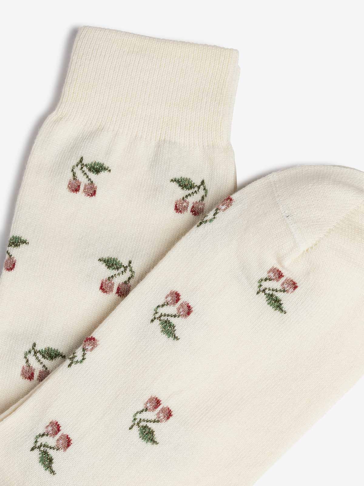 Des cerises brillantes en all over sur fond ivoire déclinées dans une gamme aux coloris brillants, pop et vitaminés.