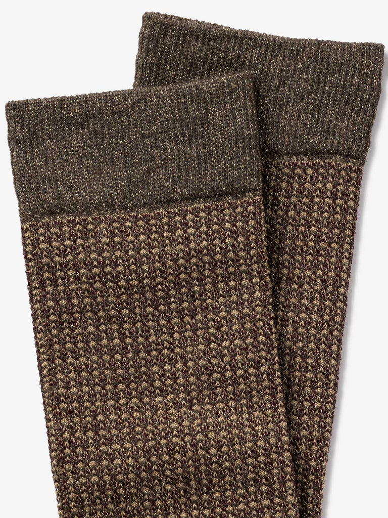Ces chaussettes fantaisie à paillettes sont tricotées en « nid d’abeille » avec 3 fils. Un jeu de points brillant et mat idéal pour une touche sartoriale pleine de féminité.