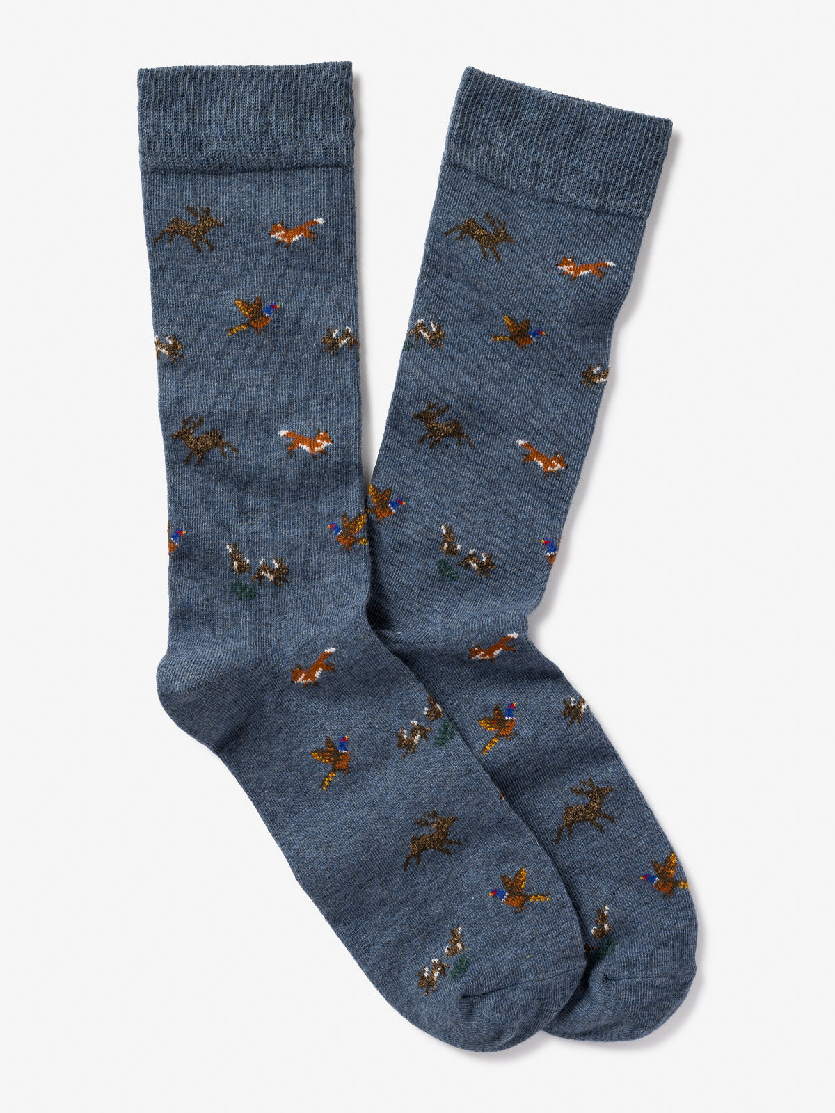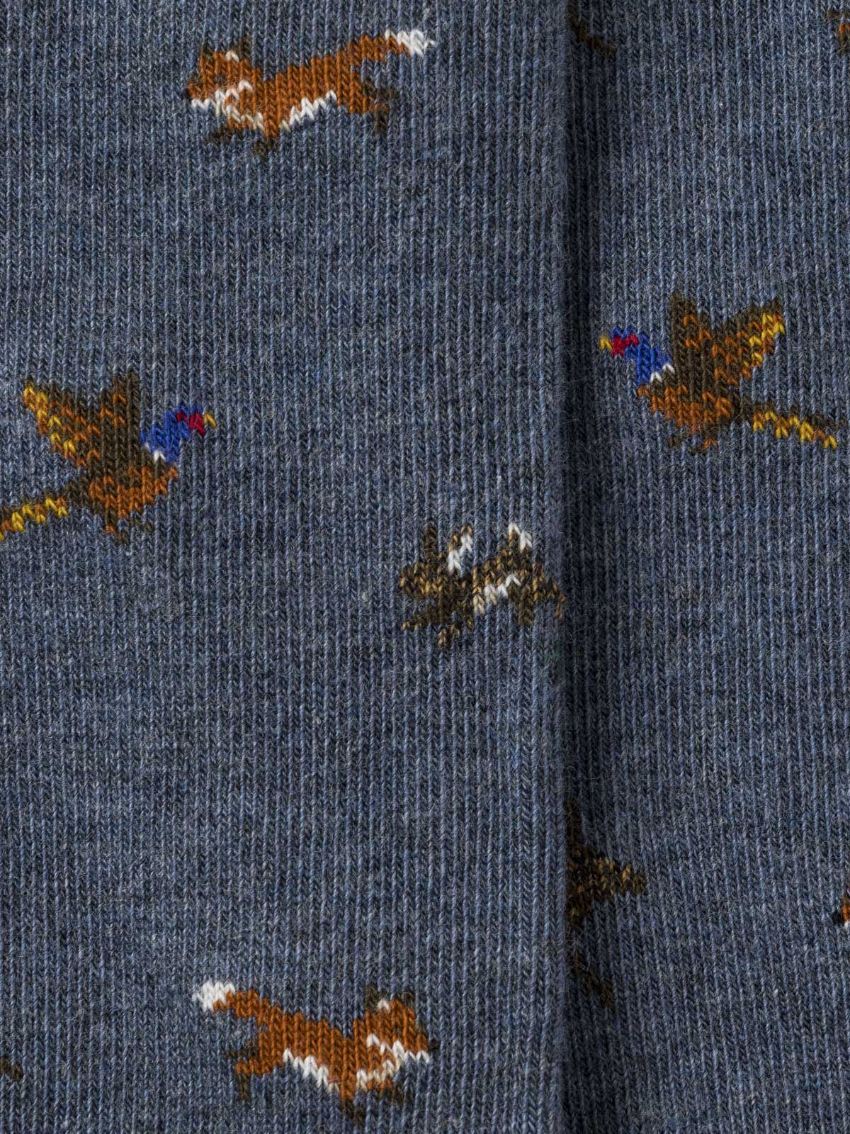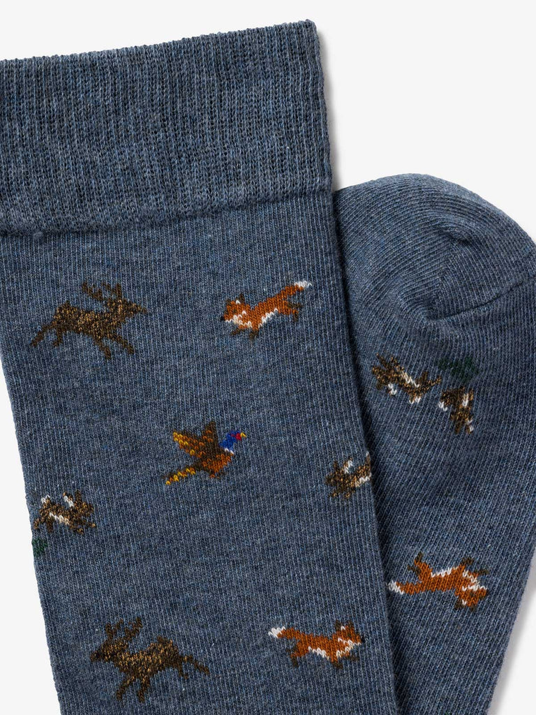 Chaussettes à dessins représentants les animaux sauvages des bois: des lapins, renards, sangliers et faisans aux coloris raffinés .