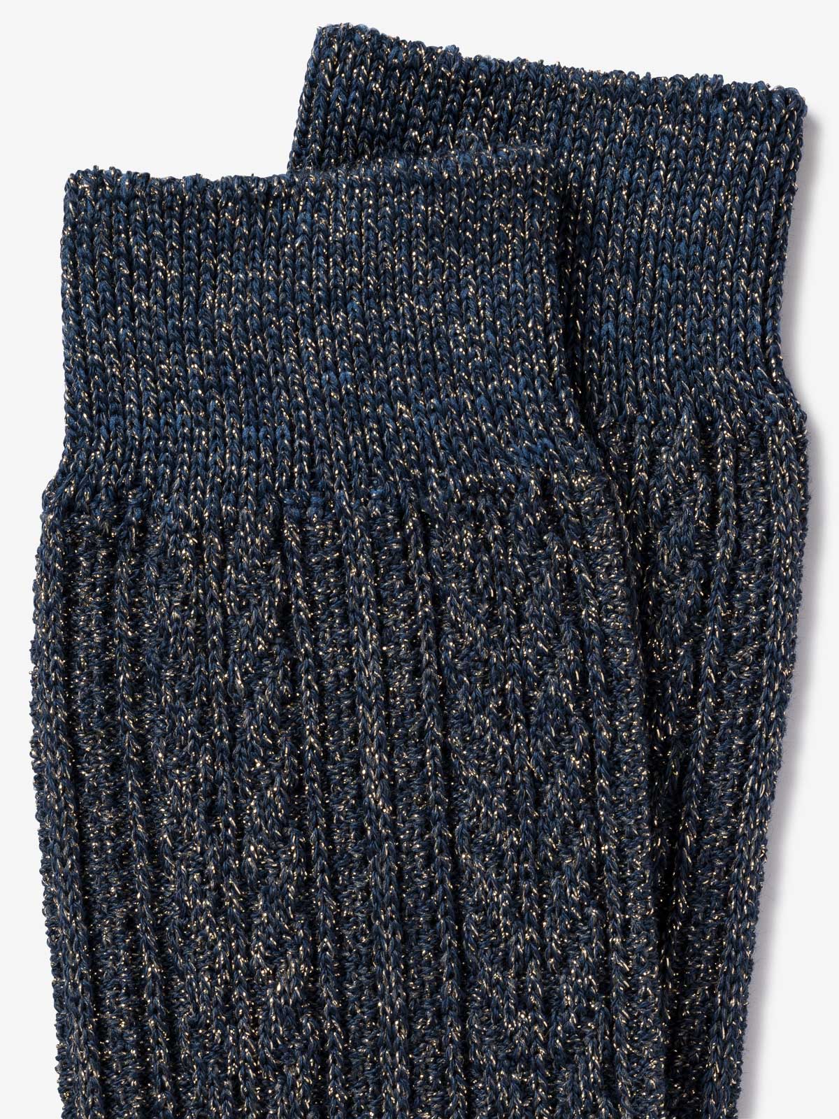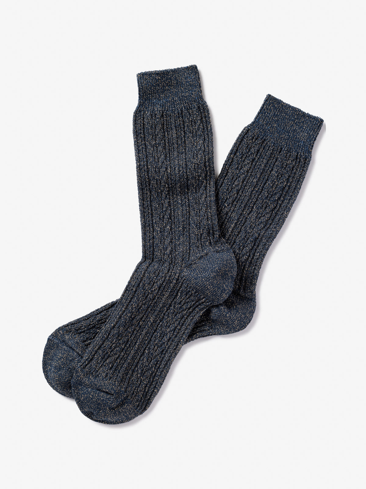 Notre modèle signature est inspiré des points fantaisie redécouverts dans des catalogues anciens de tricot main. Ces chaussettes sont réalisées sur des machines traditionnelles selon la technique du tricotage "épi de blé", unique et élégant.