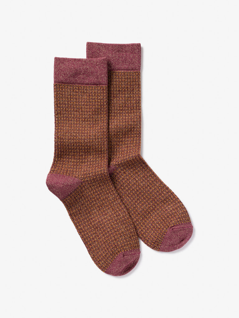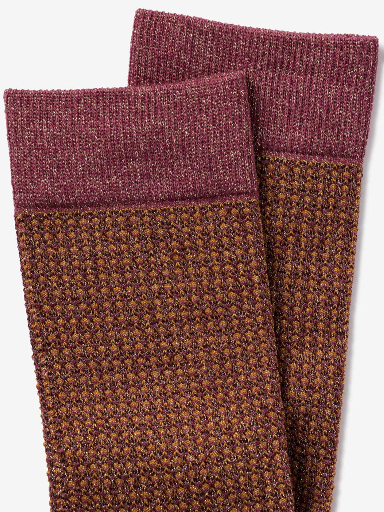 Ces chaussettes fantaisie à paillettes sont tricotées en « nid d’abeille » avec 3 fils. Un jeu de points brillant et mat idéal pour une touche sartoriale pleine de féminité.