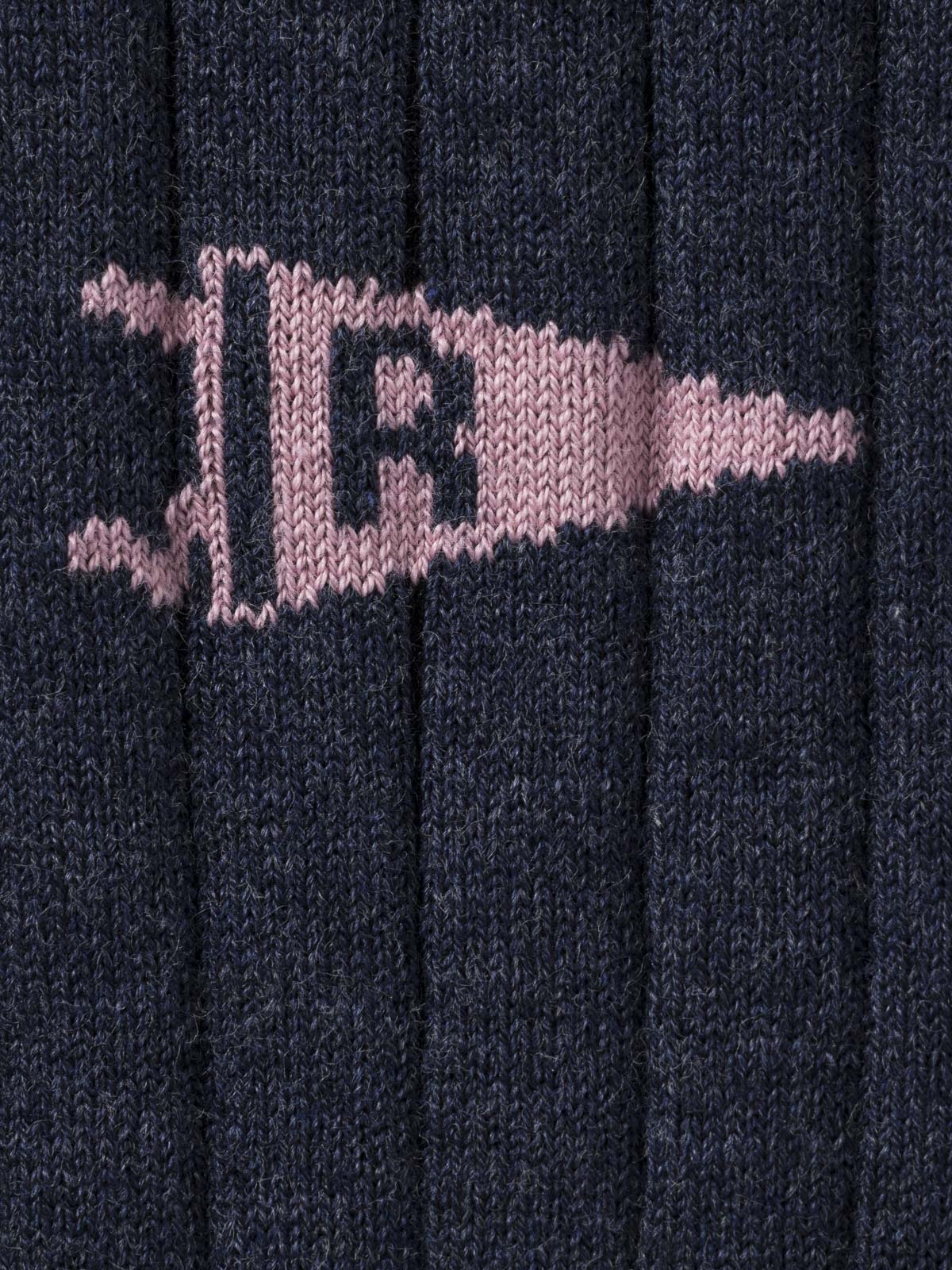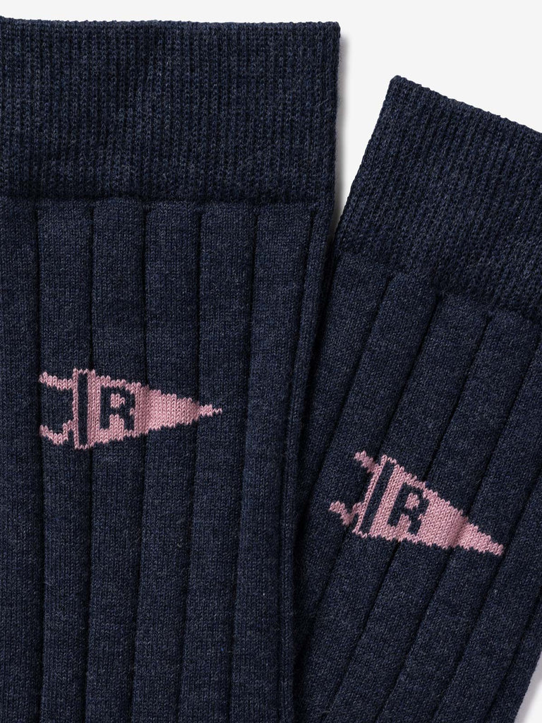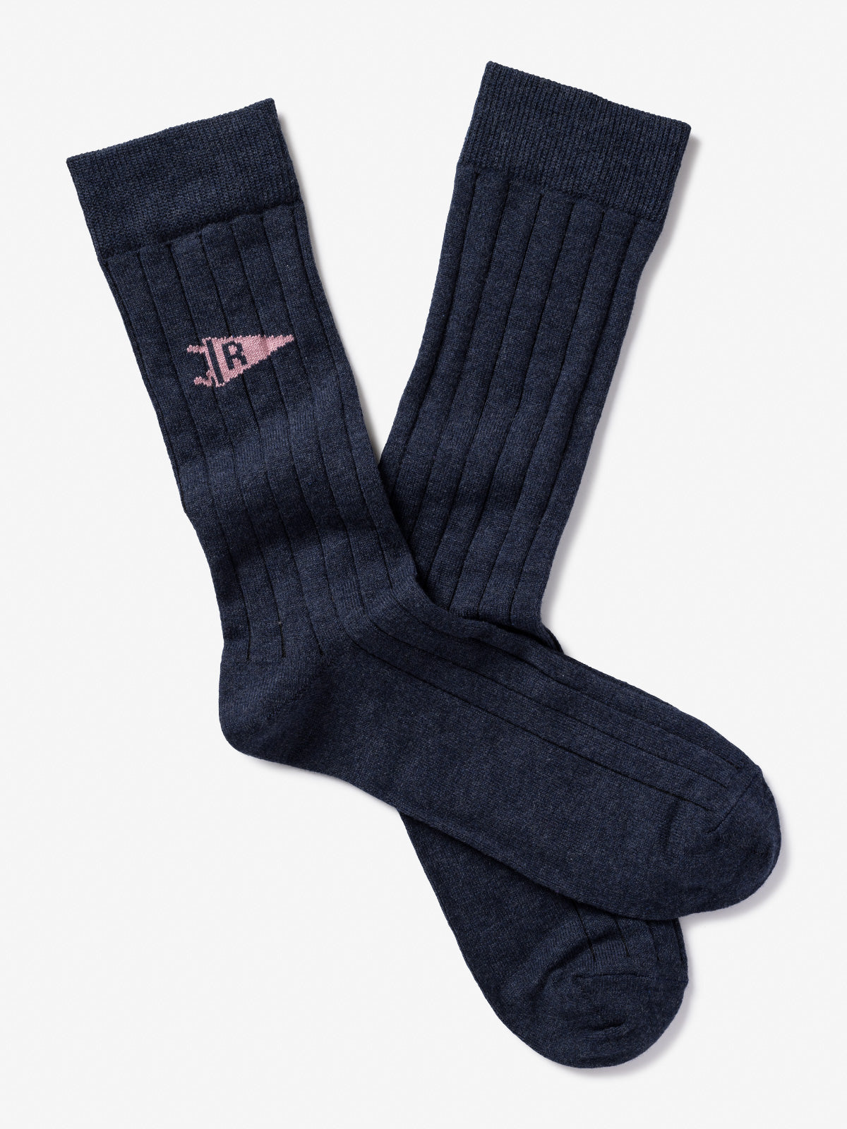 Un bel uni de type « collège » pour ces chaussettes à côtes ornées d’un fanion, emblème du logo de Royalties et qui rappelle les clubs des fraternités des universités de l’Ivy League.